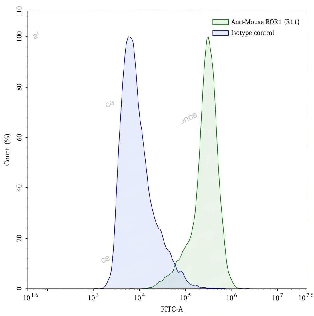 Detects ROR1 in indirect ELISAs. | Flow cytometry analysis with Anti-Mouse ROR1 mAb (R11) 5 μg/ml (TD-MX065107) on XtenCHO cells transfected with Mouse ROR1 (green histogram) or the isotype control (FMB96750) (blue histogram).