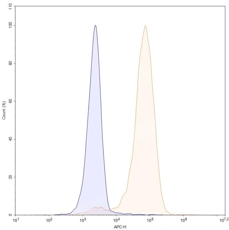 Flow-cytometry using APC anti-human DLL3 antibody. Untransfected cells (blue Histogram) and Transfected cells (Yellow Histogram) were stained with an APC anti-human DLL3 monoclonal antibody (Catalog No.:TD-MP628137) at a concentration of 5 µg/ml for 30 mins at RT. After washing, cells analysed on a NovoCyte Flow Cytometer.