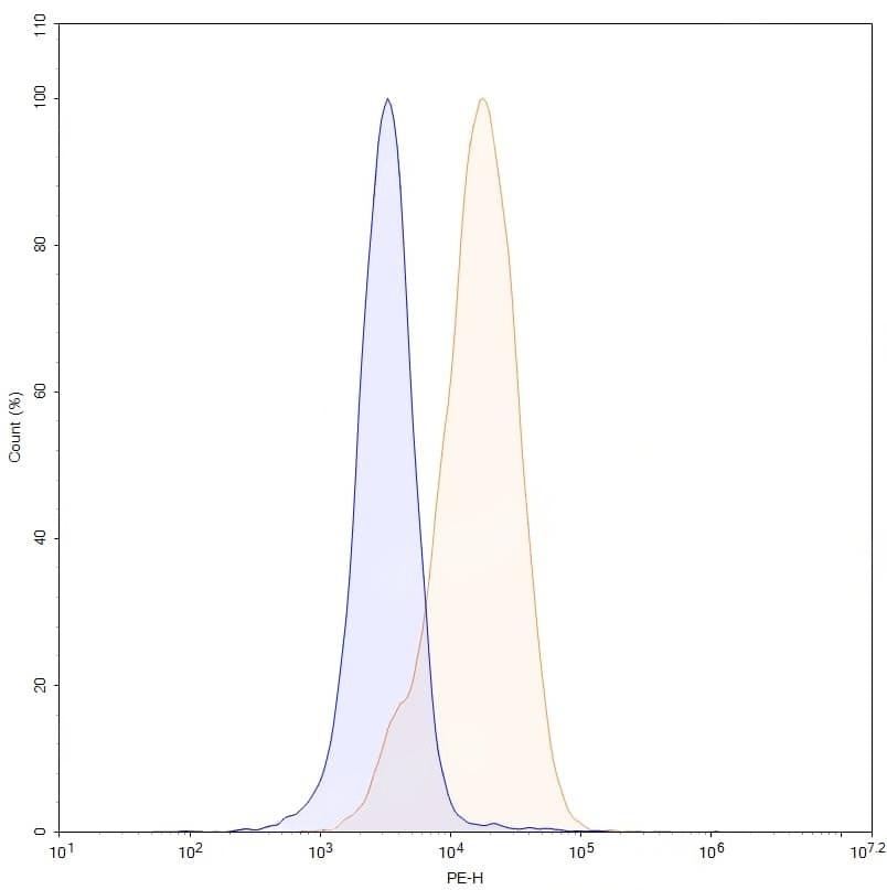 Flow-cytometry using PE anti-human DLL3 antibody. Untransfected cells (blue Histogram) and Transfected cells (Yellow Histogram) were stained with an PE anti-human DLL3 monoclonal antibody (Catalog No.:TD-MP628127) at a concentration of 5 µg/ml for 30 mins at RT. After washing, cells analysed on a NovoCyte Flow Cytometer.