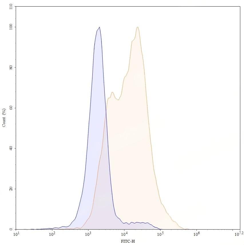 Flow-cytometry using FITC anti-Mouse CD25 antibody. Unstimulated cells (blue Histogram) and 3-day CoA-stimulated Mouse spleen cells (Yellow Histogram) were stained with an FITC anti-Mouse CD25 monoclonal antibody (Catalog No.:TD-MF996117) at a concentration of 5 µg/ml for 30 mins at RT. After washing, cells analysed on a NovoCyte Flow Cytometer.