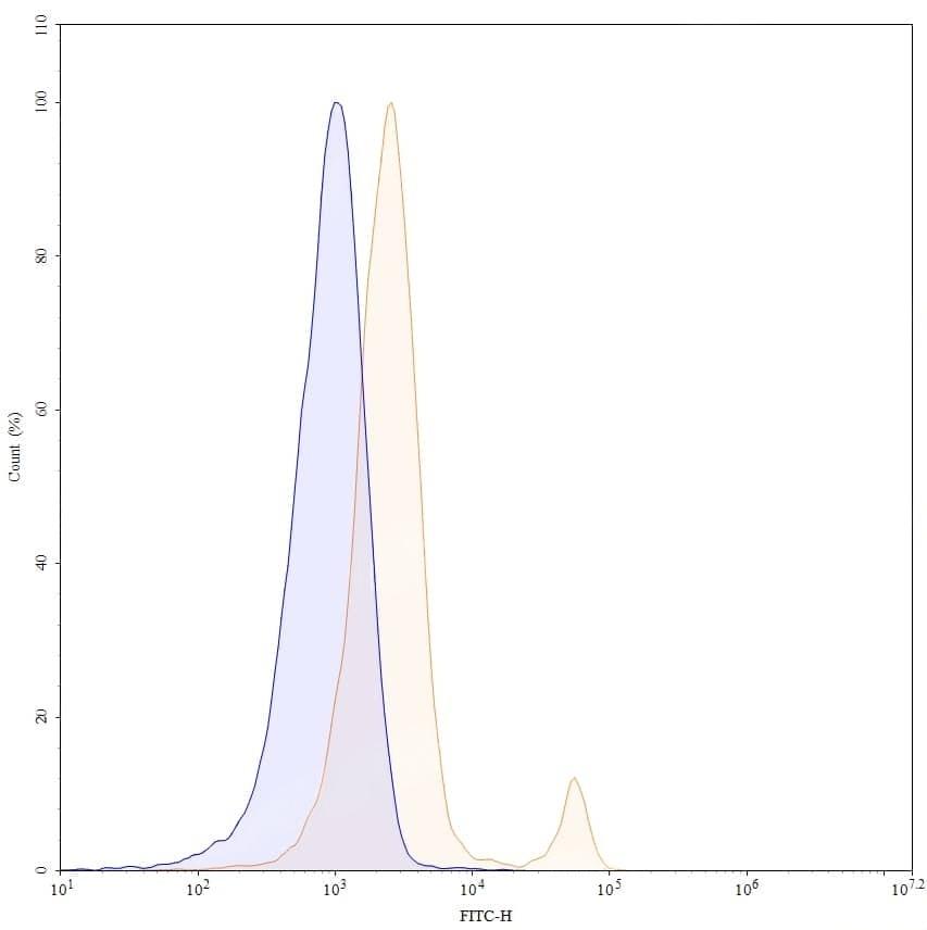 Flow-cytometry using FITC anti-Mouse CD8a antibody. Jurkat cells were stained with an irrelevant antibody (Blue Histogram) or an FITC anti-Mouse CD8a monoclonal antibody (Catalog No.:TD-MF815217, Yellow Histogram) at a concentration of 5 µg/ml for 30 mins at RT. After washing, cells analysed on a NovoCyte Flow Cytometer.