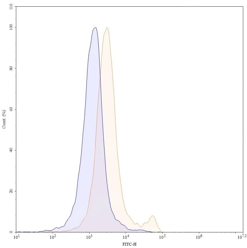 Flow-cytometry using FITC anti-Mouse CD8a antibody. Jurkat cells were stained with an irrelevant antibody (Blue Histogram) or an FITC anti-Mouse CD8a monoclonal antibody (Catalog No.:TD-MF815117, Yellow Histogram) at a concentration of 5 µg/ml for 30 mins at RT. After washing, cells analysed on a NovoCyte Flow Cytometer.