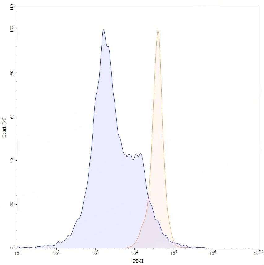 Flow-cytometry using PE anti-Mouse CD47 antibody. Mouse spleen cells were stained with an irrelevant antibody (Blue Histogram) or an PE anti-Mouse CD47 monoclonal antibody (Catalog No.:TD-MC359127, Yellow Histogram) at a concentration of 5 µg/ml for 30 mins at RT. After washing, cells analysed on a NovoCyte Flow Cytometer.