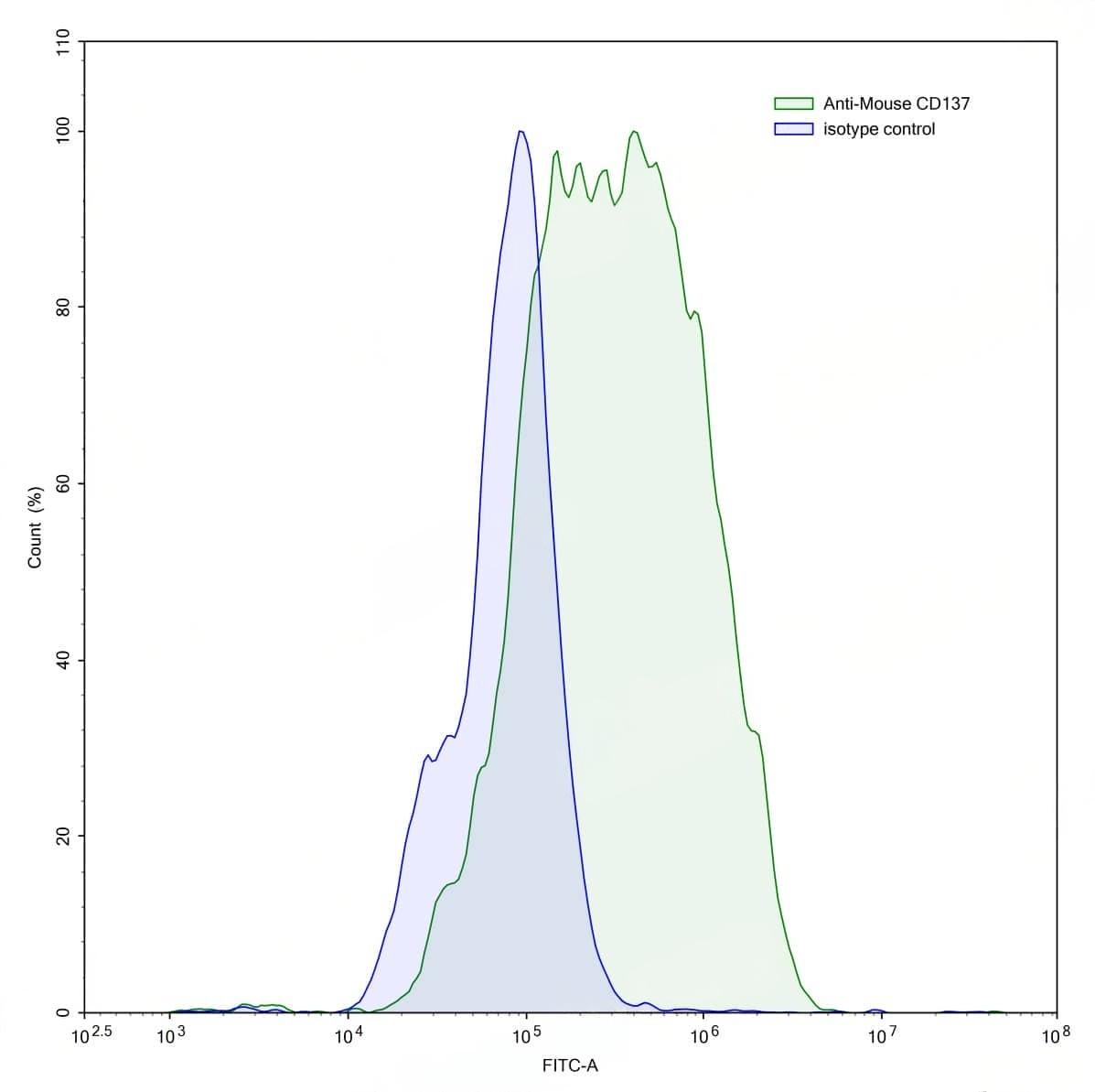Detects CD137/4-1BB/TNFRSF9 in indirect ELISAs. | Flow-cytometry using anti-mouse CD137 antibody.CD137/4-1BB/TNFRSF9 Transfected CHO cells were stained with an irrelevant antibody (Blue Histogram) or an anti-mouse CD137 antibody monoclonal antibody (Catalog No.:TD-MC336207 ,Green Histogram) at a concentration of 5 µg/ml for 30 mins at RT. After washing, bound antibody was detected using a FITC conjugated goat anti-rat antibody and cells analysed on a NovoCyte Flow Cytometer.