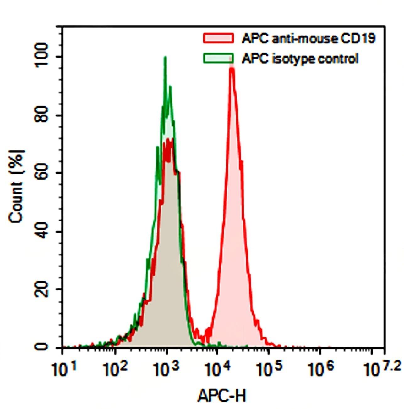 Flow-cytometry using APC anti-Mouse CD19 antibody. Mouse spleen cells were stained with an irrelevant antibody (Green Histogram) or an APC anti-Mouse CD19 antibody monoclonal antibody (Catalog No.:TD-MB996137 , Red Histogram) at a concentration of 5 µg/ml for 30 mins at RT. After washing, cells analysed on a NovoCyte Flow Cytometer.