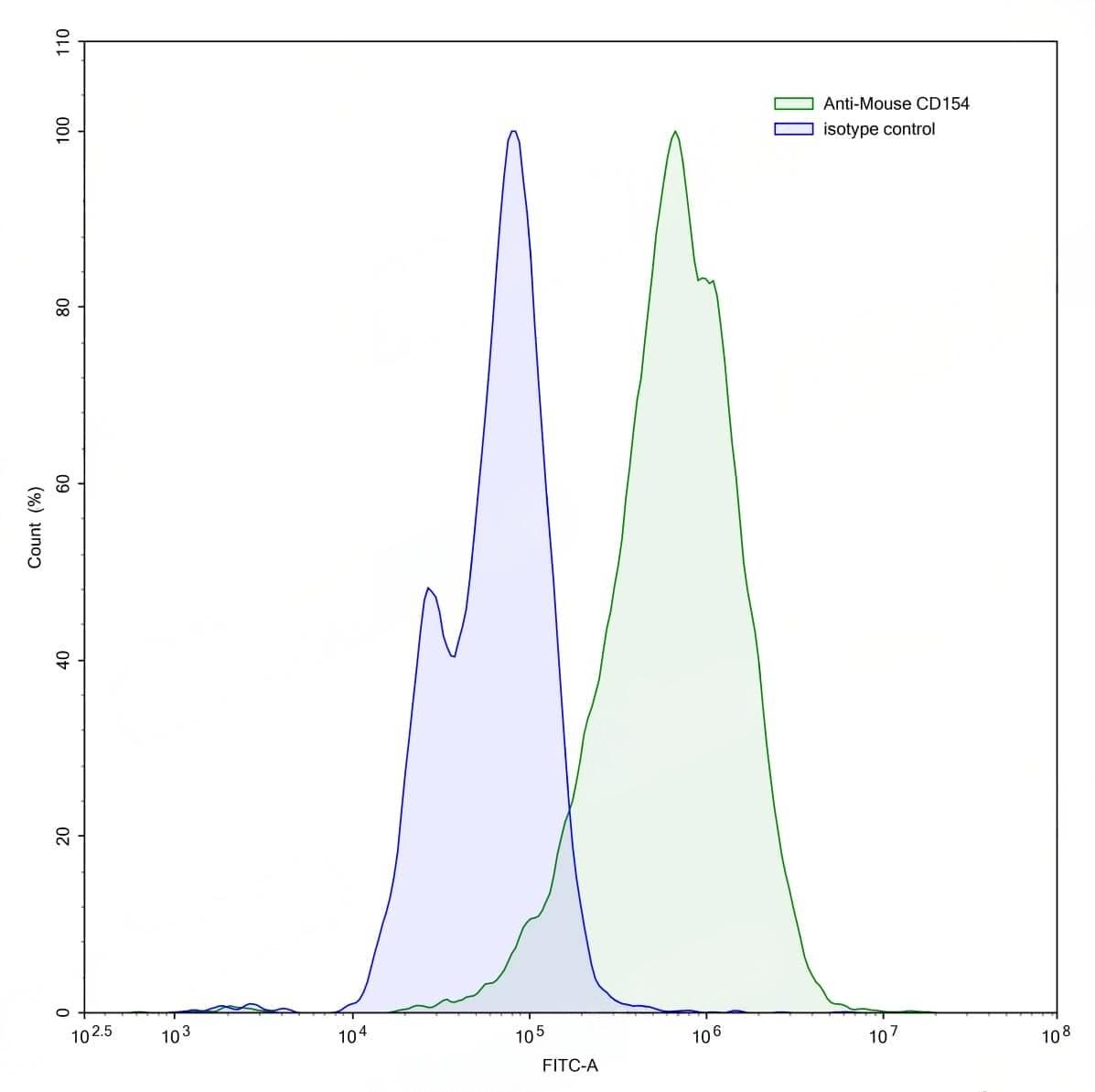 Flow-cytometry using anti-mouse CD154 antibody.CD154 Transfected CHO cells were stained with an irrelevant antibody (Blue Histogram) or an anti-mouse CD154 antibody monoclonal antibody (Catalog No.:TD-MB199107 ,Green Histogram) at a concentration of 5 µg/ml for 30 mins at RT. After washing, bound antibody was detected using a FITC conjugated goat anti-rat antibody and cells analysed on a NovoCyte Flow Cytometer.