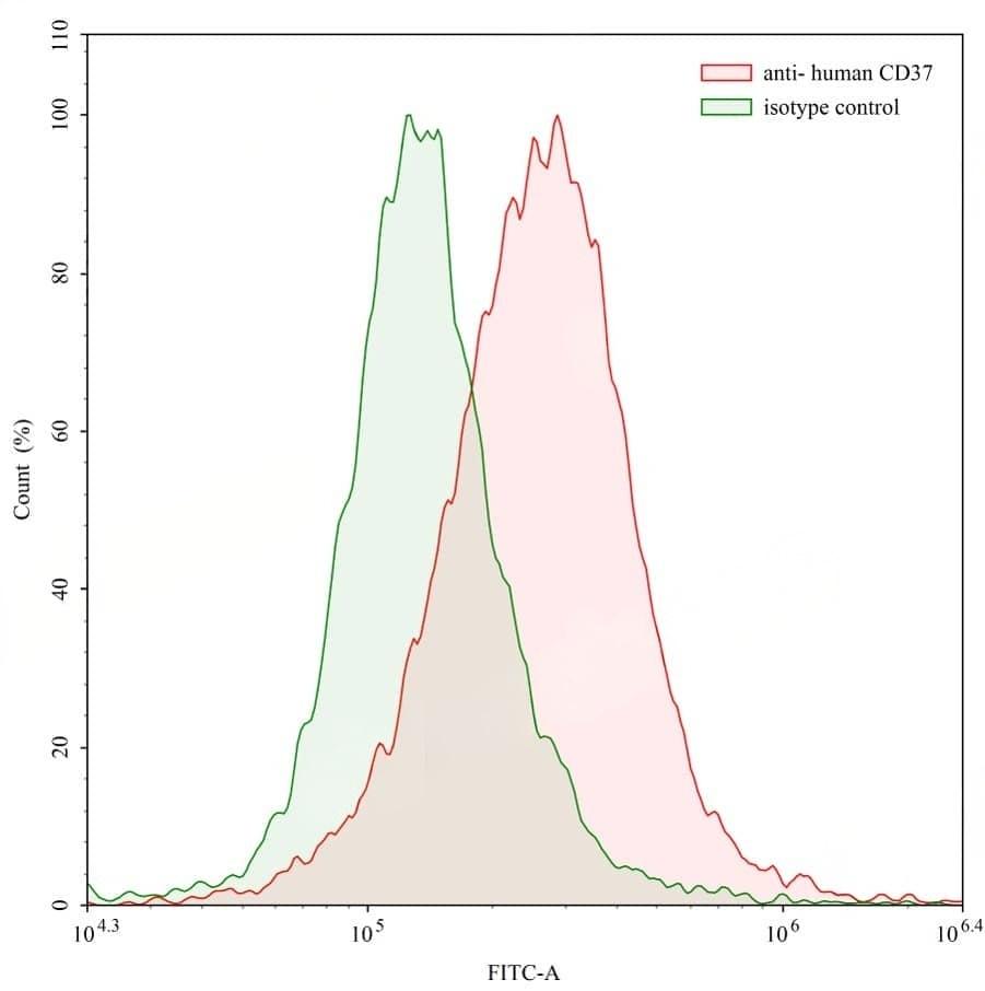 Flow-cytometry using anti-human CD37 antibody. Human RPMI-8226 cell line were stained with an irrelevant antibody (Green Histogram) or an anti-human CD37 antibody monoclonal antibody (Catalog No.:TD-HY564207 , Red Histogram) at a concentration of 20 µg/ml for 30 mins at RT. After washing, bound antibody was detected using a FITC conjugated goat anti-human antibody (Catalog No.:TD-HF690414) and cells analysed on a NovoCyte Flow Cytometer. | Western blot analysis was performed using anti-IL23A monoclonal antibody at 1ug/mL on various samples.Lane 1:recombinant human IL23A (Catalog No.:TD-HV466011)Lane 2:negative control