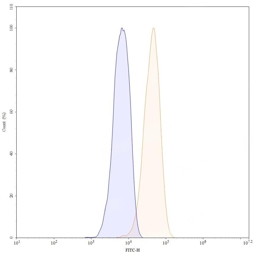 Flow-cytometry using FITC anti-human CD37 antibody. Raji cells were stained with an irrelevant antibody (Blue Histogram) or an FITC anti-human CD37 monoclonal antibody (Catalog No.:TD-HY564117, Yellow Histogram) at a concentration of 5 µg/ml for 30 mins at RT. After washing, cells analysed on a NovoCyte Flow Cytometer.