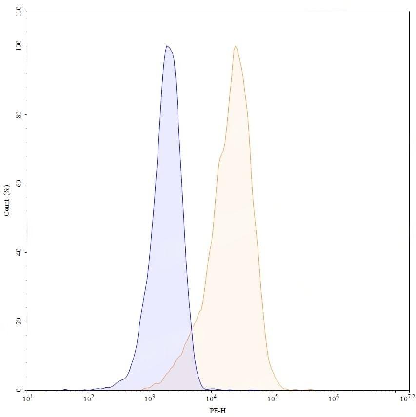 Flow-cytometry using PE anti-human CD90 antibody. Jurkat cells were stained with an irrelevant antibody (Blue Histogram) or an PE anti-human CD90 monoclonal antibody (Catalog No.:TD-HY557127, Yellow Histogram) at a concentration of 5 µg/ml for 30 mins at RT. After washing, and cells analysed on a NovoCyte Flow Cytometer.