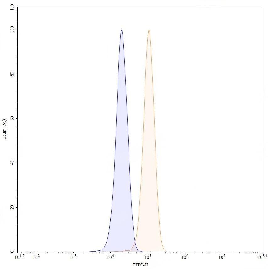 Flow-cytometry using FITC anti-human VIM antibody. U251 cells were fixed and permeabilized, then stained with an irrelevant antibody (Blue Histogram) or an FITC anti-human VIM monoclonal antibody (Catalog: TD-HY550117, Yellow Histogram) at a concentration of 5 µg/ml for 30 mins at RT. After washing, cells analysed on a NovoCyte Flow Cytometer.