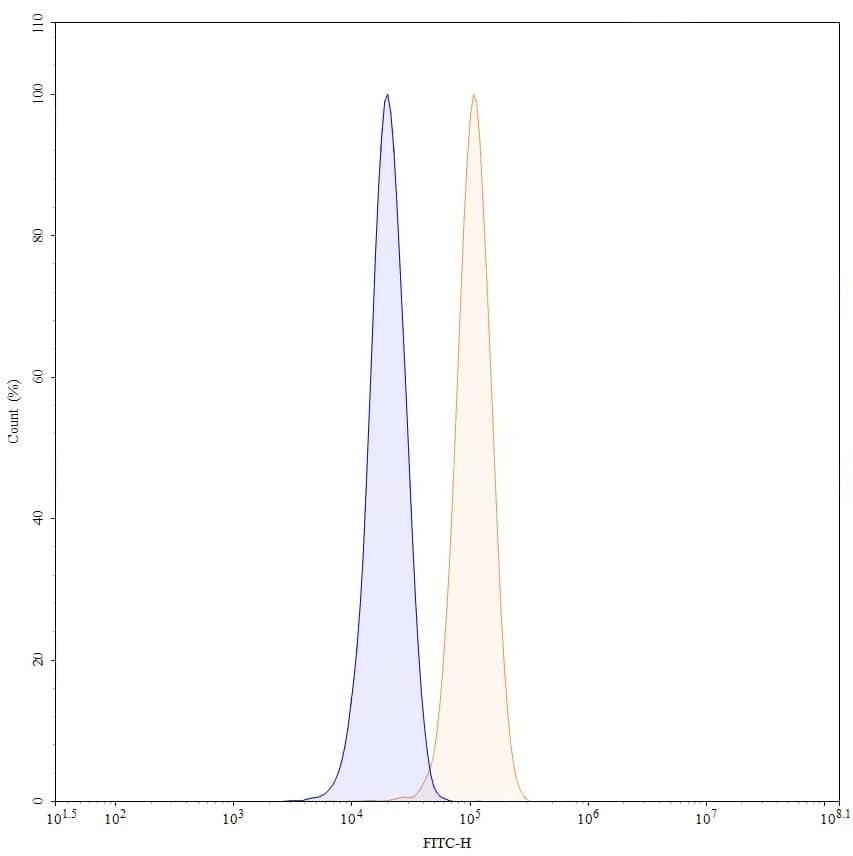 Flow-cytometry using FITC anti-human VIM antibody. U251 cells were fixed and permeabilized, then stained with an irrelevant antibody (Blue Histogram) or an FITC anti-human VIM monoclonal antibody (Catalog No.:TD-HY550117, Yellow Histogram) at a concentration of 5 µg/ml for 30 mins at RT. After washing, cells analysed on a NovoCyte Flow Cytometer.