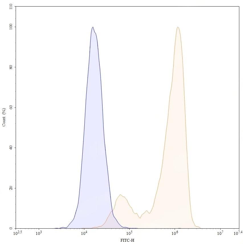 Flow-cytometry using FITC anti-human CD66e antibody. HPAC cells were stained with an irrelevant antibody (Blue Histogram) or an FITC anti-human CD66e monoclonal antibody (Catalog No.:TD-HY546117, Yellow Histogram) at a concentration of 5 µg/ml for 30 mins at RT. After washing, and cells analysed on a NovoCyte Flow Cytometer.