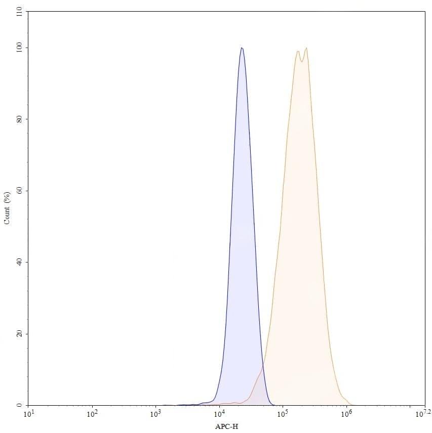 Flow-cytometry using APC anti-human CSF1 antibody. MG-63 cells were fixed and permeabilized, then stained with an irrelevant antibody (Blue Histogram) or an APC anti-human CSF1 monoclonal antibody (Catalog No.:TD-HY515137, Yellow Histogram) at a concentration of 5 µg/ml for 30 mins at RT. After washing, cells analysed on a NovoCyte Flow Cytometer.