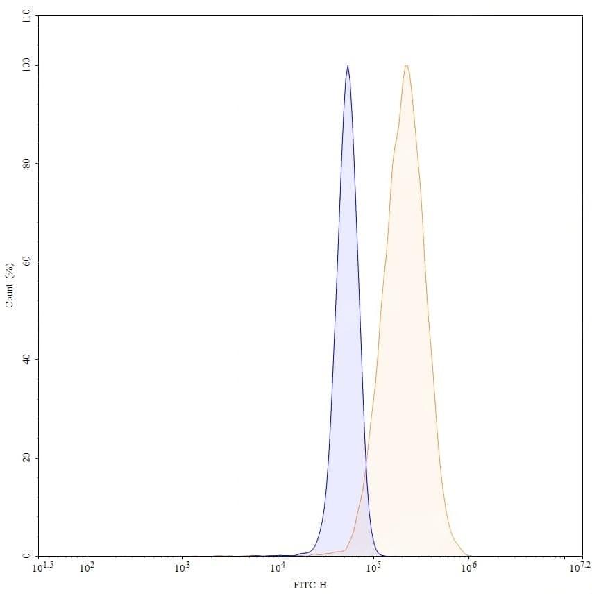 Flow-cytometry using FITC anti-human CSF1 antibody. MG-63 cells were fixed and permeabilized, then stained with an irrelevant antibody (Blue Histogram) or an FITC anti-human CSF1 monoclonal antibody (Catalog No.:TD-HY515117, Yellow Histogram) at a concentration of 5 µg/ml for 30 mins at RT. After washing, cells analysed on a NovoCyte Flow Cytometer.