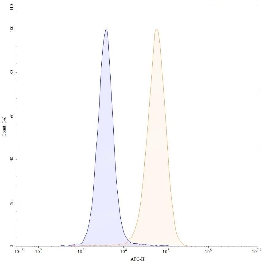 Flow-cytometry using APC anti-human CD49e antibody. HUVEC cells were stained with an irrelevant antibody (Blue Histogram) or an APC anti-human CD49e monoclonal antibody (Catalog No.:TD-HY464137, Yellow Histogram) at a concentration of 5 µg/ml for 30 mins at RT. After washing, cells analysed on a NovoCyte Flow Cytometer.