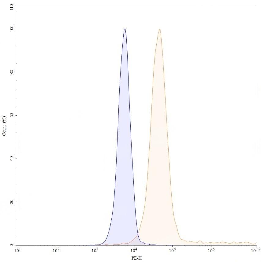 Flow-cytometry using PE anti-human CD49e antibody. HUVEC cells were stained with an irrelevant antibody (Blue Histogram) or an PE anti-human CD49e monoclonal antibody (Catalog No.:TD-HY464127, Yellow Histogram) at a concentration of 5 µg/ml for 30 mins at RT. After washing, cells analysed on a NovoCyte Flow Cytometer.