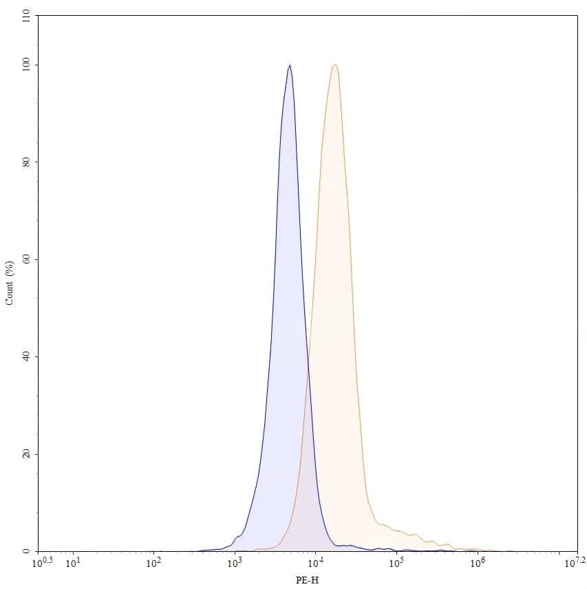Flow-cytometry using PE anti-human CD324 antibody. HT-29 cells were stained with an irrelevant antibody (Blue Histogram) or an PE anti-human CD324 monoclonal antibody (Catalog No.:TD-HY460127, Yellow Histogram) at a concentration of 5 µg/ml for 30 mins at RT. After washing, cells analysed on a NovoCyte Flow Cytometer.