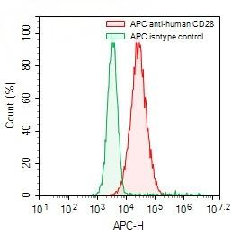 Flow-cytometry using APC anti-human CD28 antibody. RPMI-8226 cells were stained with an irrelevant antibody (Green Histogram) or an APC anti-human CD28 antibody monoclonal antibody (Catalog # TD-HY422137, Red Histogram) at a concentration of 5 µg/ml for 30 mins at RT. After washing, cells analysed on a NovoCyte Flow Cytometer.