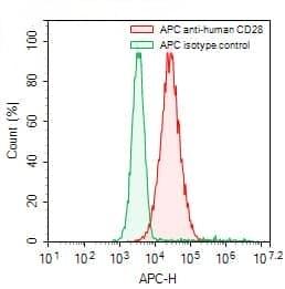 Flow-cytometry using APC anti-human CD28 antibody. RPMI-8226 cells were stained with an irrelevant antibody (Green Histogram) or an APC anti-human CD28 antibody monoclonal antibody (Catalog No.:TD-HY422137, Red Histogram) at a concentration of 5 µg/ml for 30 mins at RT. After washing, cells analysed on a NovoCyte Flow Cytometer.