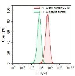 Flow-cytometry using FITC anti-human CD10/MME antibody. Daudi cells were stained with an irrelevant antibody (Green Histogram) or a FITC anti-human CD10/MME antibody monoclonal antibody (Catalog No.:TD-HY401117, Red Histogram) at a concentration of 5 µg/ml for 30 mins at RT. After washing, cells analysed on a NovoCyte Flow Cytometer.