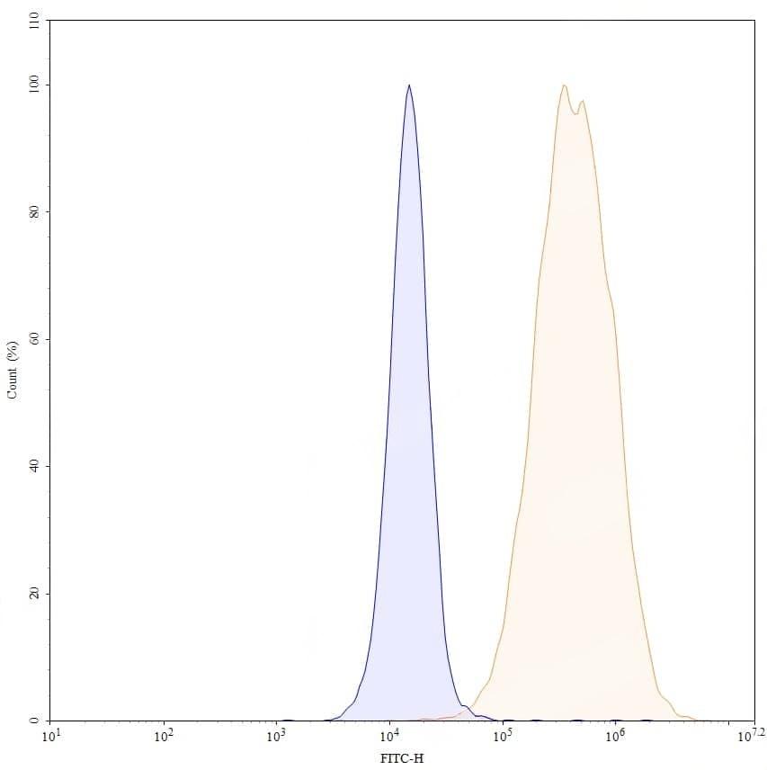 SEC-HPLC detection for Anti-Human CD10/MME Antibody (NL-1). | Detects CD10/MME in indirect ELISAs. | Flow-cytometry using anti-human CD10 antibody. Untransfected cells (blue Histogram) and Transfected cells (Yellow Histogram) were stained with an anti-human CD10 monoclonal antibody (Catalog No.:TD-HY401107) at a concentration of 5 µg/ml for 30 mins at RT. After washing, bound antibody was detected using a Goat Anti-Mouse IgG H&L Polyclonal Antibody, FITC (Catalog No.:TD-MF690414) and cells analysed on a NovoCyte Flow Cytometer.