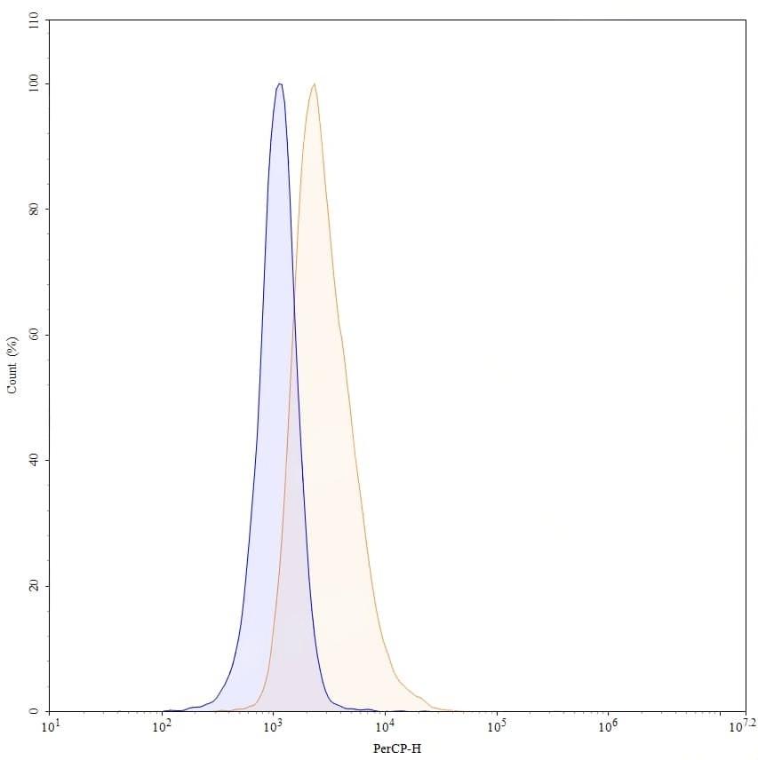 Flow-cytometry PerCP using anti-human CD16A antibody. Untransfected cells (blue Histogram) and Transfected cells (Yellow Histogram) were stained with an PerCP anti-human CD16A monoclonal antibody (Catalog No.:TD-HY386247) at a concentration of 5 µg/ml for 30 mins at RT. After washing, cells analysed on a NovoCyte Flow Cytometer.