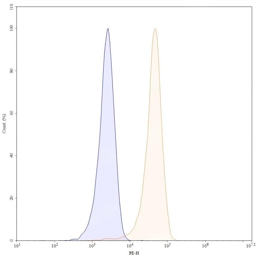 Flow-cytometry using PE anti-human CD18 antibody. Jurkat cells were stained with an irrelevant antibody (Blue Histogram) or an PE anti-human CD18 monoclonal antibody (Catalog No.:TD-HY378127, Yellow Histogram) at a concentration of 5 µg/ml for 30 mins at RT. After washing, and cells analysed on a NovoCyte Flow Cytometer.