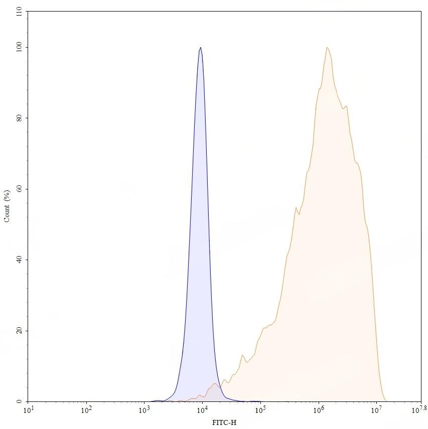Flow-cytometry using anti-human TROP2 antibody.HeLa cells were stained with an irrelevant antibody (Blue Histogram) or an anti-human TROP2 antibody monoclonal antibody (Catalog # TD-HY373107 ,Green Histogram) at a concentration of 5 µg/ml for 30 mins at RT. After washing, bound antibody was detected using a FITC conjugated goat anti-mouse antibody (Catalog # TD-MF690414) and cells analysed on a NovoCyte Flow Cytometer.