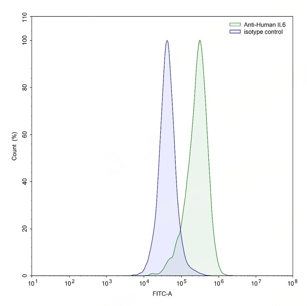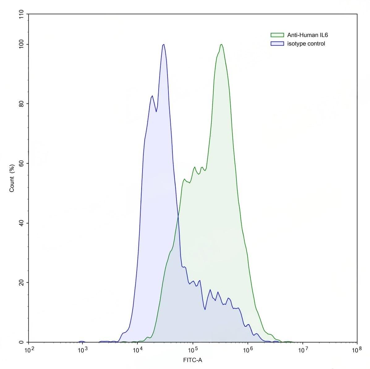 Flow-cytometry using anti-human IL6 antibody.IL6 Transfected CHO cells were stained with an irrelevant antibody (Blue Histogram) or an anti-human IL6 antibody monoclonal antibody (Catalog No.:TD-HY328107 ,Green Histogram) at a concentration of 5 ug/ml for 30 mins at RT. After washing, bound antibody was detected using a FITC conjugated goat anti-mouse antibody (Catalog No.:TD-MF690414) and cells analysed on a NovoCyte Flow Cytometer. | Flow-cytometry using anti-human IL6 antibody.LPS treated THP-1 cells were stained with an irrelevant antibody (Blue Histogram) or an anti-human IL6 antibody monoclonal antibody (Catalog No.:TD-HY328107 ,Green Histogram) at a concentration of 5 ug/ml for 30 mins at RT. After washing, bound antibody was detected using a FITC conjugated goat anti-mouse antibody (Catalog No.:TD-MF690414) and cells analysed on a NovoCyte Flow Cytometer.