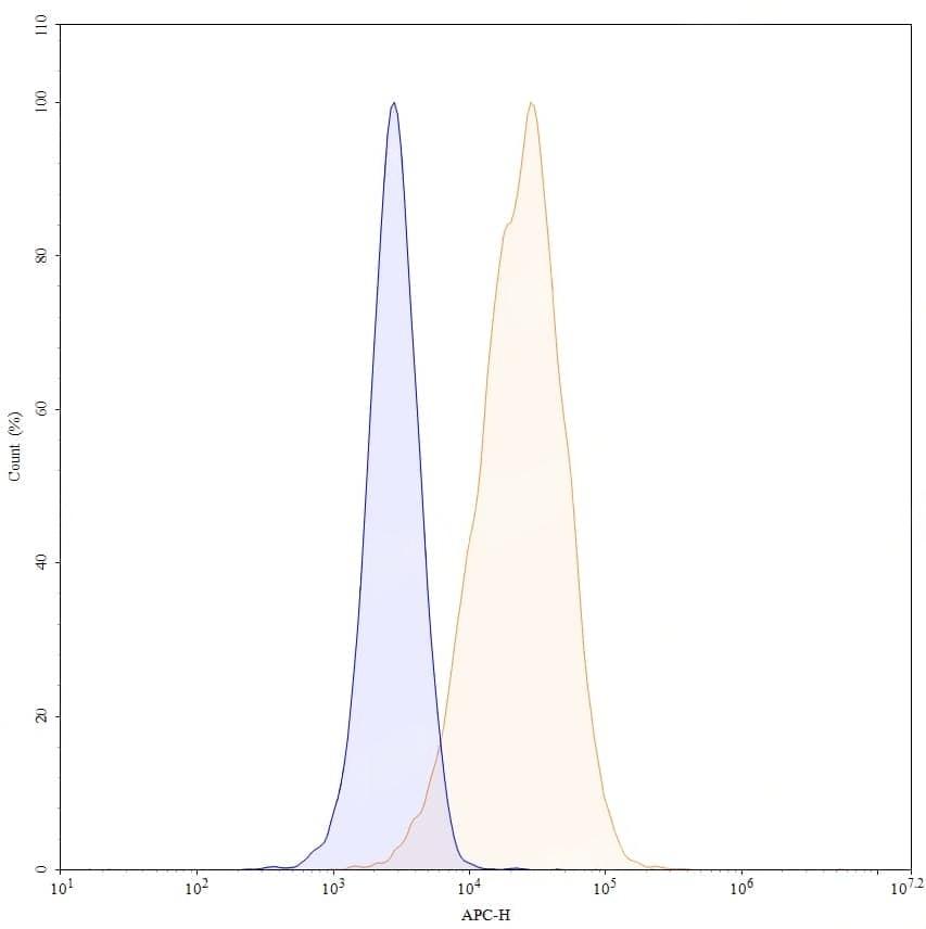 Flow-cytometry using APC anti-human CD54 antibody. RPMI-8226 cells were stained with an irrelevant antibody (Blue Histogram) or an APC anti-human CD54 monoclonal antibody (Catalog No.:TD-HY321237, Yellow Histogram) at a concentration of 5 µg/ml for 30 mins at RT. After washing, cells analysed on a NovoCyte Flow Cytometer.