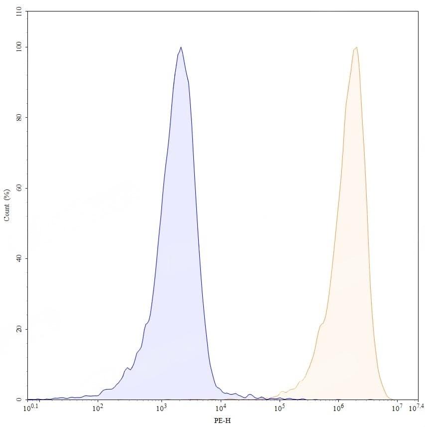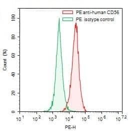 Flow-cytometry using PE anti-human CD56 antibody. SH-SY5Y cells were stained with an irrelevant antibody (Green Histogram) or a PE anti-human CD56 antibody monoclonal antibody (Catalog No.:TD-HY309127, Red Histogram) at a concentration of 5 µg/ml for 30 mins at RT. After washing, cells analysed on a NovoCyte Flow Cytometer. | Flow-cytometry using PE anti-human CD56 antibody. SH-SY5Y cells were stained with an irrelevant antibody (Blue Histogram) or an PE anti-human CD56 monoclonal antibody (Catalog No.:TD-HY309127, Yellow Histogram) at a concentration of 5 µg/ml for 30 mins at RT. After washing, and cells analysed on a NovoCyte Flow Cytometer.