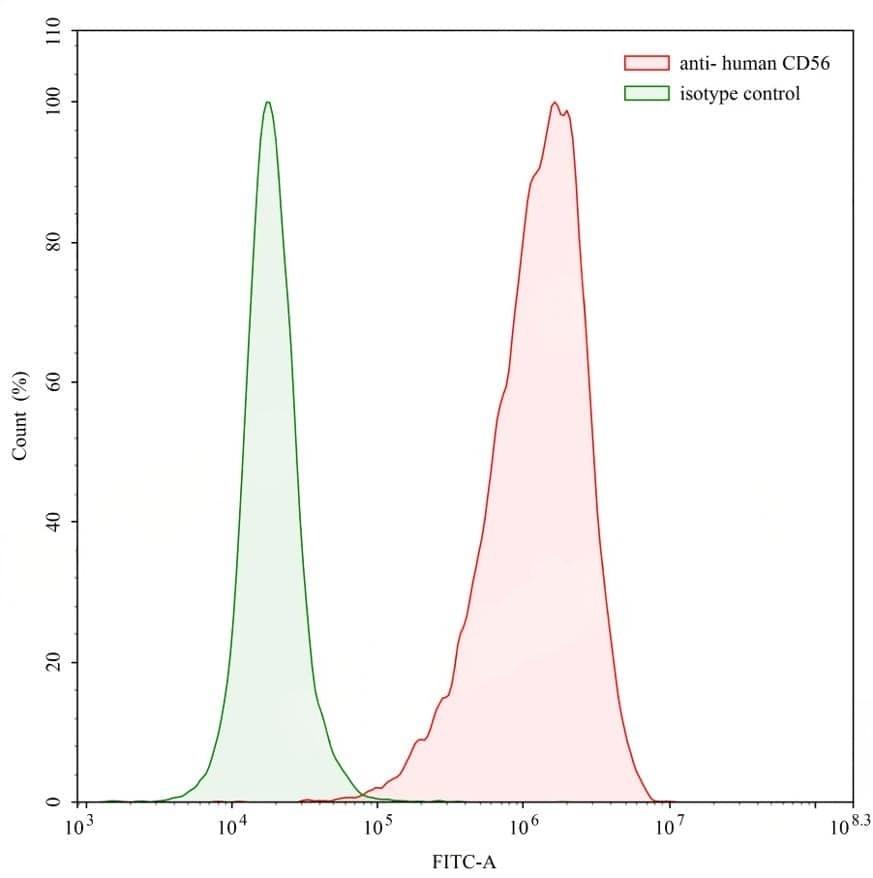 SEC-HPLC detection for Anti-Human CD56/NCAM1 Antibody (N901-DM1). | Flow-cytometry using anti-human CD56 antibody. Human SH-SY5Y cell line were stained with an irrelevant antibody (Green Histogram) or an anti-human CD56 antibody monoclonal antibody (Catalog No.:TD-HY309107 , Red Histogram) at a concentration of 20 µg/ml for 30 mins at RT. After washing, bound antibody was detected using a CoraLite488 conjugated goat anti-mouse antibody (Catalog No.:TD-MF690314) and cells analysed on a NovoCyte Flow Cytometer.