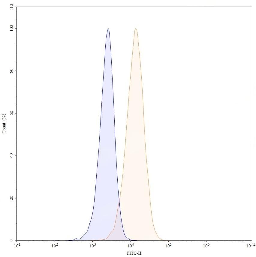 Flow-cytometry using FITC anti-human CD7 antibody. Jurkat cells were stained with an irrelevant antibody (Blue Histogram) or an FITC anti-human CD7 monoclonal antibody (Catalog No.:TD-HY302117, Yellow Histogram) at a concentration of 5 µg/ml for 30 mins at RT. After washing, cells analysed on a NovoCyte Flow Cytometer.