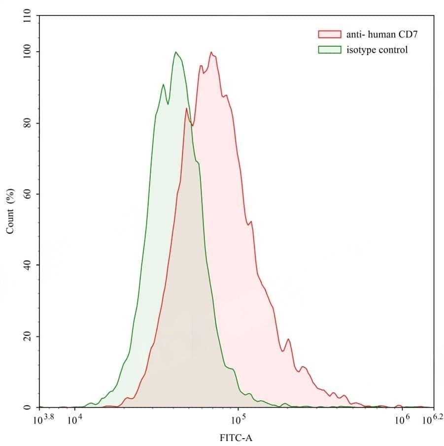 Flow-cytometry using anti-human CD7 antibody. Human Jurkat cell line were stained with an irrelevant antibody (Green Histogram) or an anti-human CD7 antibody monoclonal antibody (Catalog No.:TD-HY302107 , Red Histogram) at a concentration of 20µg/ml for 30 mins at RT. After washing, bound antibody was detected using a CoraLite488 conjugated goat anti-mouse antibody (Catalog No.:TD-MF690314) and cells analysed on a NovoCyte Flow Cytometer.