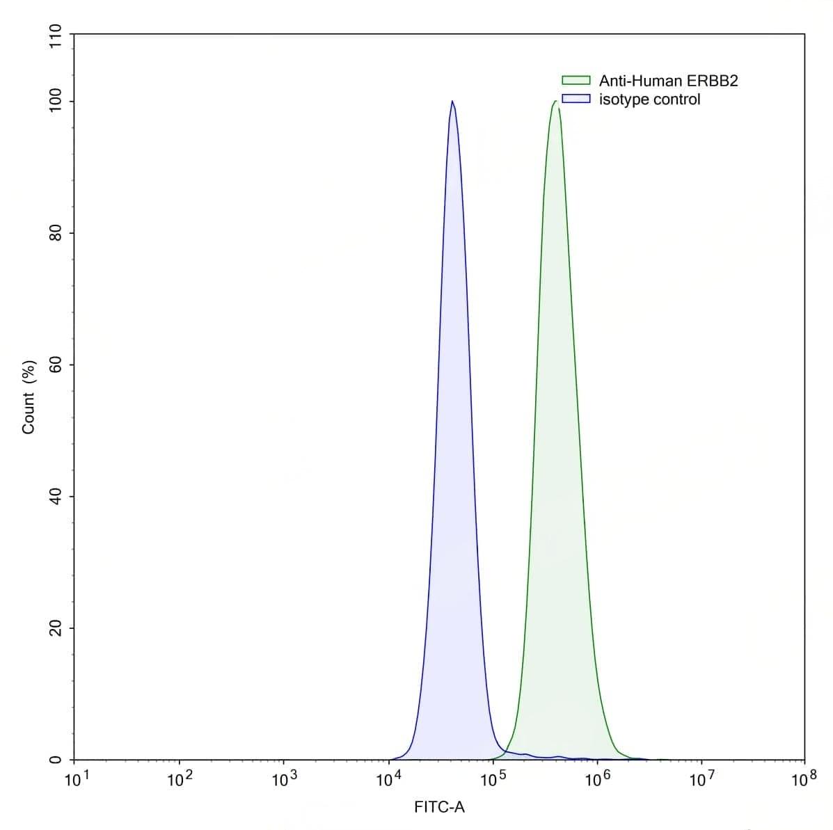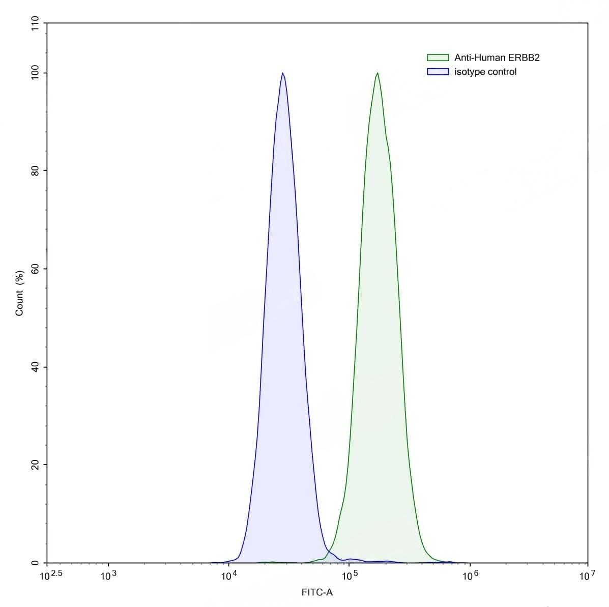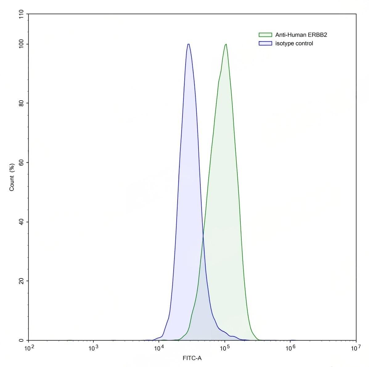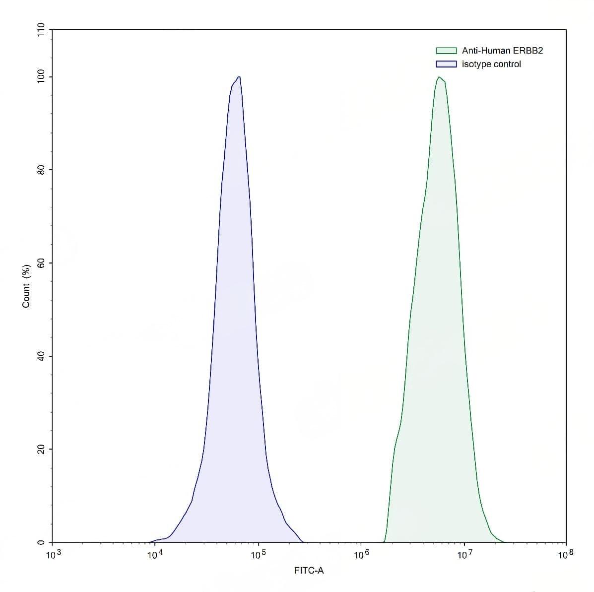 Flow-cytometry using anti-human ERBB2 antibody.MCF7 cells were stained with an irrelevant antibody (Blue Histogram) or an anti-human ERBB2 antibody monoclonal antibody (Catalog No.:TD-HY286307 ,Green Histogram) at a concentration of 5 ug/ml for 30 mins at RT. After washing, bound antibody was detected using a FITC conjugated goat anti-mouse antibody (Catalog No.:TD-MF690414) and cells analysed on a NovoCyte Flow Cytometer. | Flow-cytometry using anti-human ERBB2 antibody.MDA-MB-231 cells were stained with an irrelevant antibody (Blue Histogram) or an anti-human ERBB2 antibody monoclonal antibody (Catalog No.:TD-HY286307 ,Green Histogram) at a concentration of 5 ug/ml for 30 mins at RT. After washing, bound antibody was detected using a FITC conjugated goat anti-mouse antibody (Catalog No.:TD-MF690414) and cells analysed on a NovoCyte Flow Cytometer. | Flow-cytometry using anti-human ERBB2 antibody.MDA-MB-231 cells were stained with an irrelevant antibody (Blue Histogram) or an anti-human ERBB2 antibody monoclonal antibody (Catalog No.:TD-HY286307 ,Green Histogram) at a concentration of 5 ug/ml for 30 mins at RT. After washing, bound antibody was detected using a FITC conjugated goat anti-mouse antibody (Catalog No.:TD-MF690414) and cells analysed on a NovoCyte Flow Cytometer. | Flow-cytometry using anti-human ERBB2 antibody.SK-BR-3 cells were stained with an irrelevant antibody (Blue Histogram) or an anti-human ERBB2 antibody monoclonal antibody (Catalog No.:TD-HY286307 ,Green Histogram) at a concentration of 5 ug/ml for 30 mins at RT. After washing, bound antibody was detected using a FITC conjugated goat anti-mouse antibody (Catalog No.:TD-MF690414) and cells analysed on a NovoCyte Flow Cytometer.