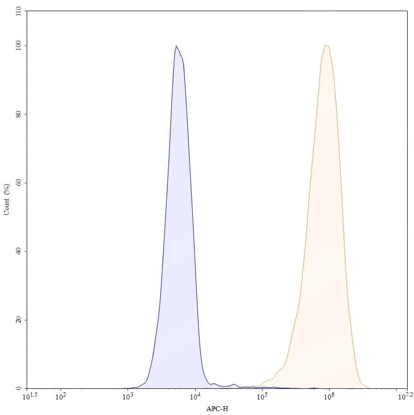 Flow-cytometry using PE anti-human CD340 antibody. SK-BR-3 cells were stained with an irrelevant antibody (Blue Histogram) or an PE anti-human CD340 monoclonal antibody (Catalog No.:TD-HY286127, Yellow Histogram) at a concentration of 5 µg/ml for 30 mins at RT. After washing, and cells analysed on a NovoCyte Flow Cytometer.
