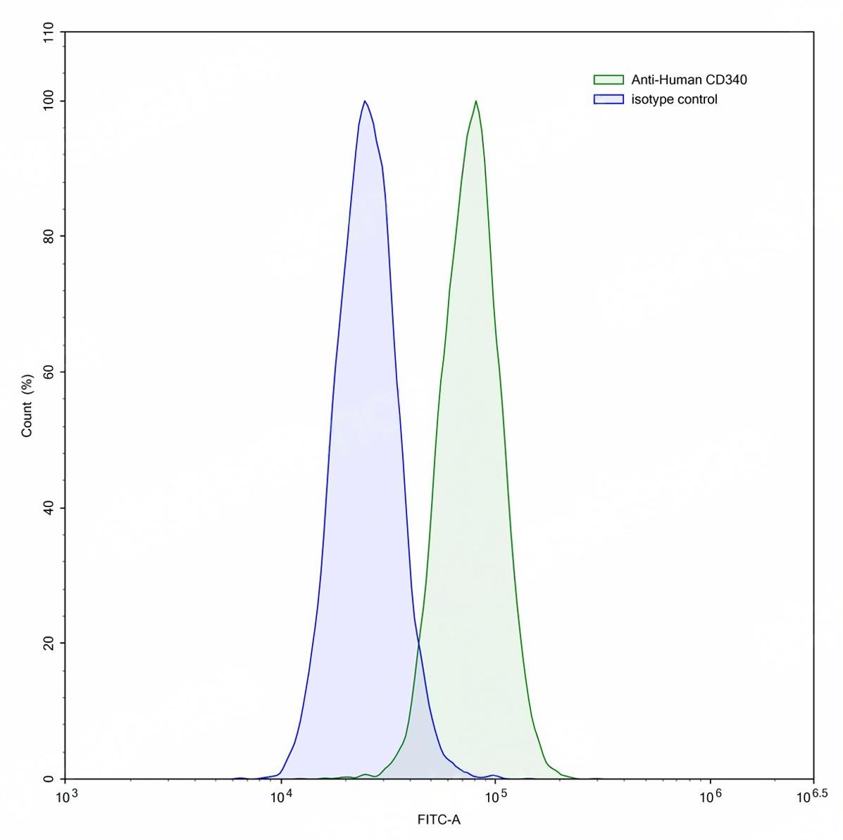 Flow-cytometry using anti-human CD340 antibody.MDA-MB-231 cells were stained with an irrelevant antibody (Blue Histogram) or an anti-human CD340 antibody monoclonal antibody (Catalog:TD-HY286107 ,Green Histogram) at a concentration of 5 ug/ml for 30 mins at RT. After washing, bound antibody was detected using a FITC conjugated goat anti-human antibody (Catalog:TD-HF690414) and cells analysed on a NovoCyte Flow Cytometer.