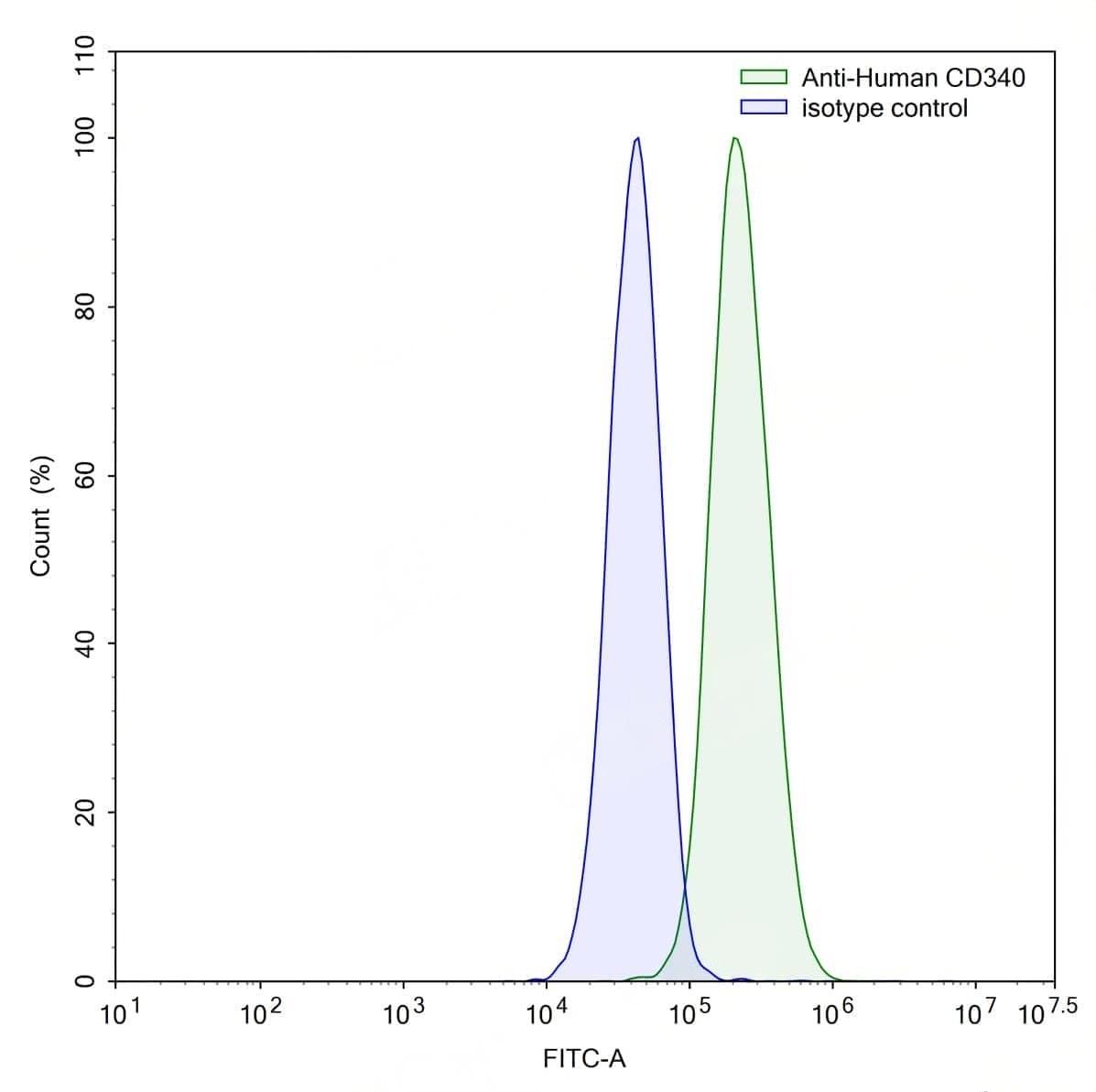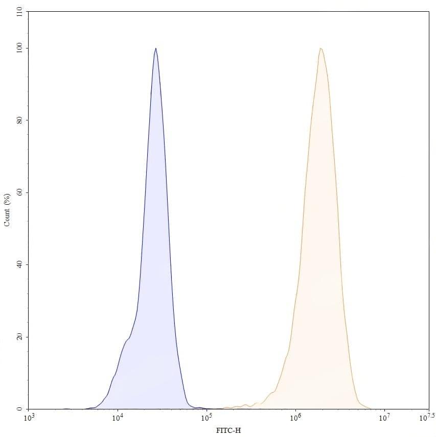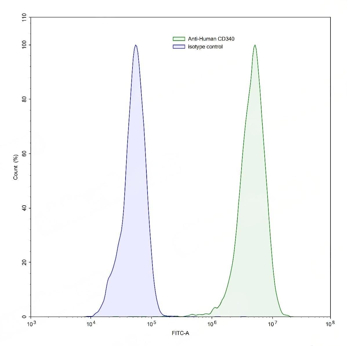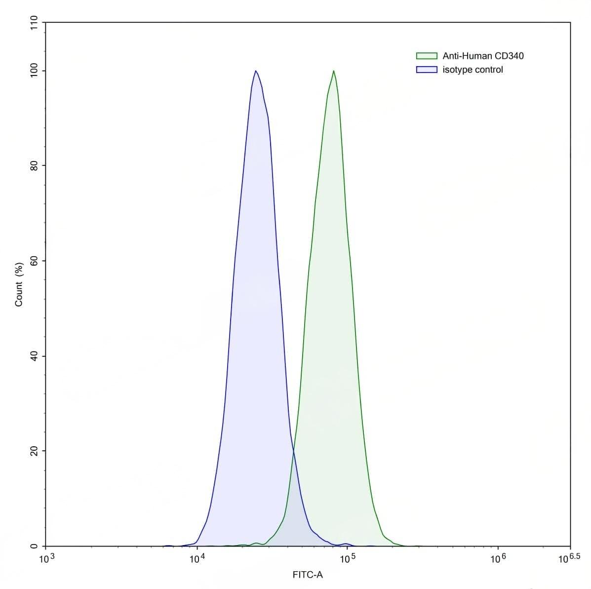 Flow-cytometry using anti-human CD340 antibody.MCF7 cells were stained with an irrelevant antibody (Blue Histogram) or an anti-human CD340 antibody monoclonal antibody (Catalog No.:TD-HY286107 ,Green Histogram) at a concentration of 5 ug/ml for 30 mins at RT. After washing, bound antibody was detected using a FITC conjugated goat anti-human antibody (Catalog No.:TD-HF690414) and cells analysed on a NovoCyte Flow Cytometer. | Flow-cytometry using anti-human CD340 antibody.MDA-MB-231 cells were stained with an irrelevant antibody (Blue Histogram) or an anti-human CD340 antibody monoclonal antibody (Catalog No.:TD-HY286107 ,Green Histogram) at a concentration of 5 ug/ml for 30 mins at RT. After washing, bound antibody was detected using a FITC conjugated goat anti-human antibody (Catalog No.:TD-HF690414) and cells analysed on a NovoCyte Flow Cytometer. | Flow-cytometry using anti-human CD340 antibody.SK-BR-3 cells were stained with an irrelevant antibody (Blue Histogram) or an anti-human CD340 antibody monoclonal antibody (Catalog No.:TD-HY286107 ,Green Histogram) at a concentration of 5 ug/ml for 30 mins at RT. After washing, bound antibody was detected using a FITC conjugated goat anti-human antibody (Catalog No.:TD-HF690414) and cells analysed on a NovoCyte Flow Cytometer. | SEC-HPLC detection for Anti-Human CD340/ERBB2/HER2 Antibody (4D5V8). | Flow-cytometry using anti-human CD340 antibody. SK-BR-3 cells were stained with an irrelevant antibody (Blue Histogram) or an anti-human CD340 monoclonal antibody (Catalog No.:TD-HY286107, Yellow Histogram) at a concentration of 5 µg/ml for 30 mins at RT. After washing, bound antibody was detected using a a Goat Anti-Human IgG H&L Polyclonal Antibody, FITC (Catalog No.:TD-HF690414) and cells analysed on a NovoCyte Flow Cytometer. | Flow-cytometry using anti-human CD340 antibody. MCF-7 cells were stained with an irrelevant antibody (Blue Histogram) or an anti-human CD340 monoclonal antibody (Catalog No.:TD-HY286107, Yellow Histogram) at a concentration of 5 µg/ml for 30 mins at RT. After washing, bound antibody was detected using a a Goat Anti-Human IgG H&L Polyclonal Antibody, FITC (Catalog No.:TD-HF690414) and cells analysed on a NovoCyte Flow Cytometer.