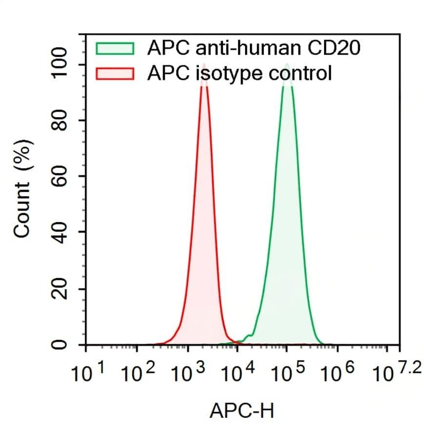 Flow-cytometry using APC anti-Human CD20 antibody. Daudi cells were stained with an irrelevant antibody (Red Histogram) or an APC anti-Human CD20 antibody monoclonal antibody (Catalog No.:TD-HY257637 , Green Histogram) at a concentration of 5 µg/ml for 30 mins at RT. After washing, cells analysed on a NovoCyte Flow Cytometer.