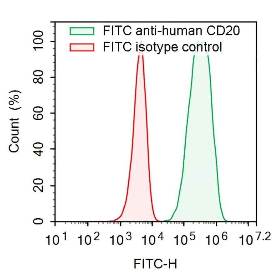 Flow-cytometry using FITC anti-Human CD20 antibody. Daudi cells were stained with an irrelevant antibody (Red Histogram) or a FITC anti-Human CD20 antibody monoclonal antibody (Catalog No.:TD-HY257517 , Green Histogram) at a concentration of 5 µg/ml for 30 mins at RT. After washing, cells analysed on a NovoCyte Flow Cytometer.
