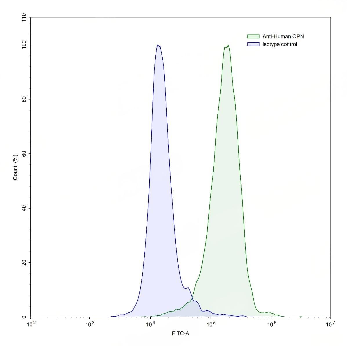 SDS-PAGE for Anti-Human OPN/SPP1 Antibody (SAA0512) | Flow-cytometry using anti-human OPN antibody.U937 cells were stained with an irrelevant antibody (Blue Histogram) or an anti-human OPN antibody monoclonal antibody (Catalog No.:TD-HY207107 ,Green Histogram) at a concentration of 5 µg/ml for 30 mins at RT. After washing, bound antibody was detected using a FITC conjugated goat anti-mouse antibody (Catalog No.:TD-MF690414) and cells analysed on a NovoCyte Flow Cytometer. | Western blot analysis was performed using anti-OPN/SPP1 monoclonal antibody at 1ug/mL on various samples.Lane 1:recombinant human OPN/SPP1 (Catalog No.:TD-HY207012)Lane 2:negative control