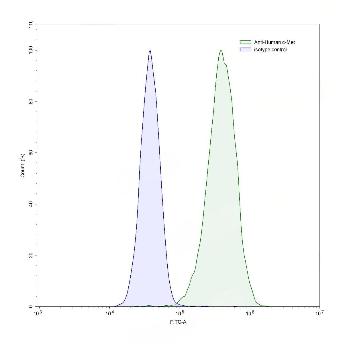 Flow-cytometry using anti-human c-Met antibody.HeLa cells were stained with an irrelevant antibody (Blue Histogram) or an anti-human c-Met antibody monoclonal antibody (Catalog No.:TD-HY196207 ,Green Histogram) at a concentration of 5 µg/ml for 30 mins at RT. After washing, bound antibody was detected using a FITC conjugated goat anti-human antibody (Catalog No.:TD-HF690414) and cells analysed on a NovoCyte Flow Cytometer. | Flow-cytometry using anti-human c-Met antibody.HepG2 cells were stained with an irrelevant antibody (Blue Histogram) or an anti-human c-Met antibody monoclonal antibody (Catalog No.:TD-HY196207 ,Green Histogram) at a concentration of 5 µg/ml for 30 mins at RT. After washing, bound antibody was detected using a FITC conjugated goat anti-human antibody (Catalog No.:TD-HF690414) and cells analysed on a NovoCyte Flow Cytometer. | Flow-cytometry using anti-human c-Met antibody.HT-29 cells were stained with an irrelevant antibody (Blue Histogram) or an anti-human c-Met antibody monoclonal antibody (Catalog No.:TD-HY196207 ,Green Histogram) at a concentration of 5 µg/ml for 30 mins at RT. After washing, bound antibody was detected using a FITC conjugated goat anti-human antibody (Catalog No.:TD-HF690414) and cells analysed on a NovoCyte Flow Cytometer.