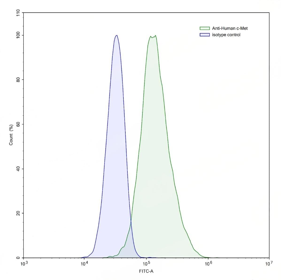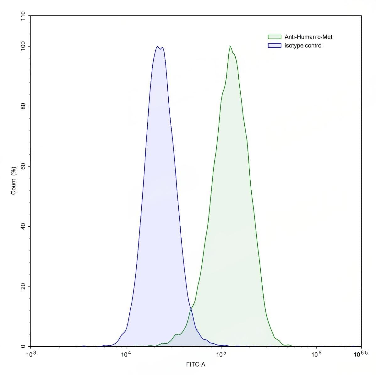 Flow-cytometry using anti-human c-Met antibody.HeLa cells were stained with an irrelevant antibody (Blue Histogram) or an anti-human c-Met antibody monoclonal antibody (Catalog No.:TD-HY196107 ,Green Histogram) at a concentration of 5 µg/ml for 30 mins at RT. After washing, bound antibody was detected using a FITC conjugated goat anti-human antibody (Catalog No.:TD-HF690414) and cells analysed on a NovoCyte Flow Cytometer. | Flow-cytometry using anti-human c-Met antibody.HepG2 cells were stained with an irrelevant antibody (Blue Histogram) or an anti-human c-Met antibody monoclonal antibody (Catalog No.:TD-HY196107 ,Green Histogram) at a concentration of 5 µg/ml for 30 mins at RT. After washing, bound antibody was detected using a FITC conjugated goat anti-human antibody (Catalog No.:TD-HF690414) and cells analysed on a NovoCyte Flow Cytometer. | Flow-cytometry using anti-human c-Met antibody.HT-29 cells were stained with an irrelevant antibody (Blue Histogram) or an anti-human c-Met antibody monoclonal antibody (Catalog No.:TD-HY196107 ,Green Histogram) at a concentration of 5 µg/ml for 30 mins at RT. After washing, bound antibody was detected using a FITC conjugated goat anti-human antibody (Catalog No.:TD-HF690414) and cells analysed on a NovoCyte Flow Cytometer.