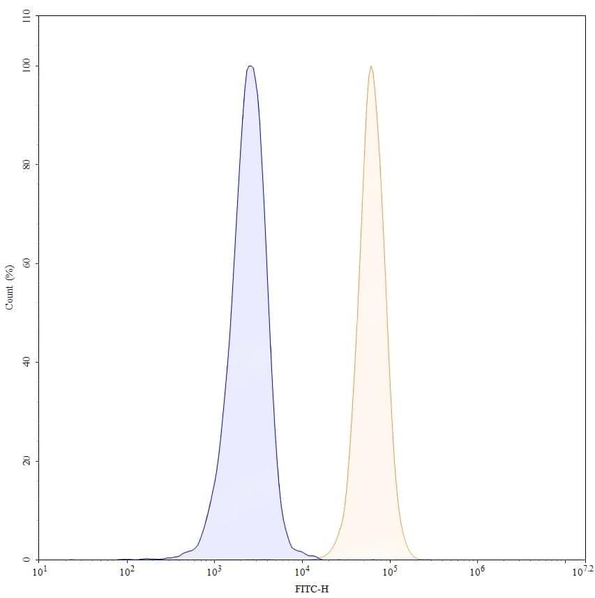 Flow-cytometry using FITC anti-human CD45 antibody. Jurkat cells were stained with an irrelevant antibody (Blue Histogram) or an FITC anti-human CD45 monoclonal antibody (Catalog No.:TD-HY195117, Yellow Histogram) at a concentration of 5 µg/ml for 30 mins at RT. After washing, and cells analysed on a NovoCyte Flow Cytometer.