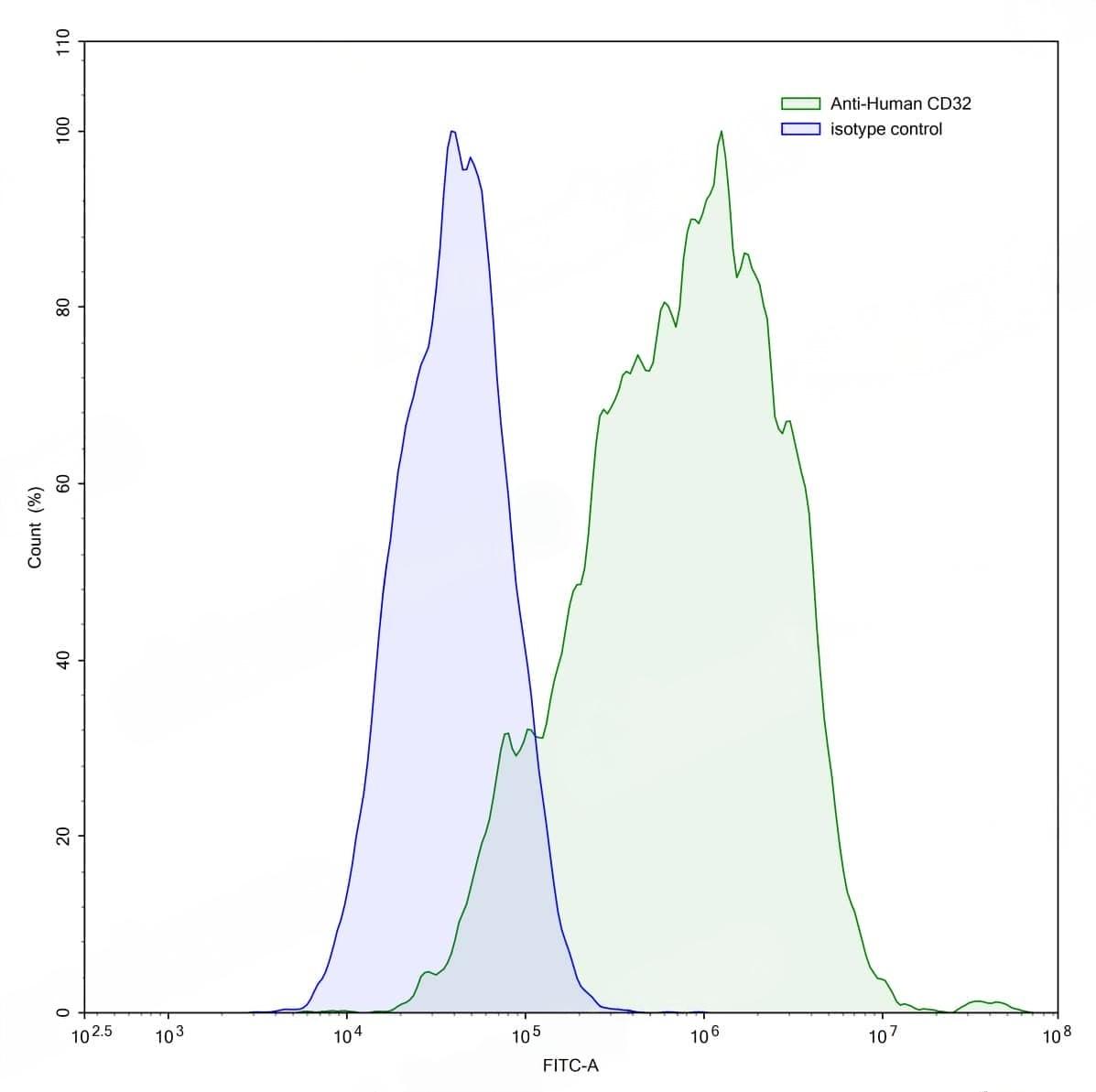 Flow-cytometry using anti-human CD32 antibody.CD32 Transfected CHO cells were stained with an irrelevant antibody (Blue Histogram) or an anti-human CD32 antibody monoclonal antibody (Catalog No.:TD-HY139107 ,Green Histogram) at a concentration of 5 µg/ml for 30 mins at RT. After washing, bound antibody was detected using a FITC conjugated goat anti-human antibody (Catalog No.:TD-HF690414) and cells analysed on a NovoCyte Flow Cytometer.
