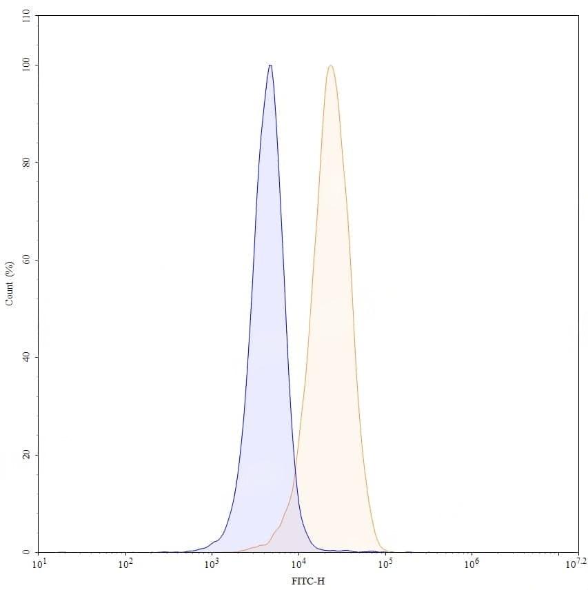 Flow-cytometry using FITC anti-human CD2 antibody. Jurkat cells were stained with an irrelevant antibody (Blue Histogram) or an FITC anti-human CD2 monoclonal antibody (Catalog No.:TD-HY113217, Yellow Histogram) at a concentration of 5 µg/ml for 30 mins at RT. After washing, and cells analysed on a NovoCyte Flow Cytometer.