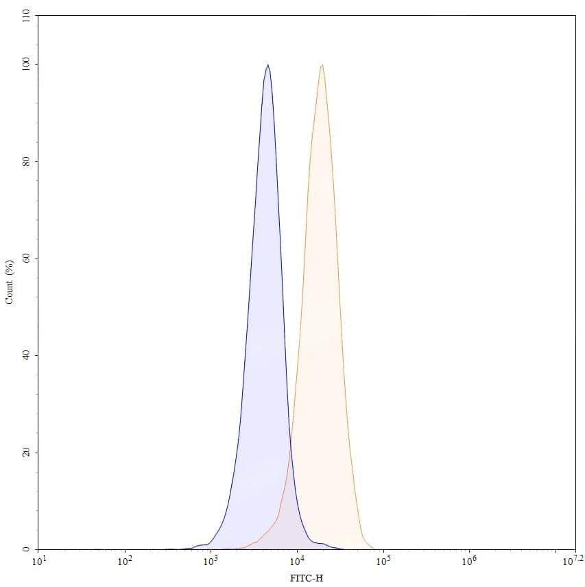 Flow-cytometry using FITC anti-human CD2 antibody. Jurkat cells were stained with an irrelevant antibody (Blue Histogram) or an FITC anti-human CD2 monoclonal antibody (Catalog No.:TD-HY113117, Yellow Histogram) at a concentration of 5 µg/ml for 30 mins at RT. After washing, and cells analysed on a NovoCyte Flow Cytometer.