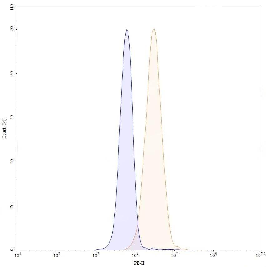 Flow-cytometry using PE anti-human CD220 antibody. MCF-7 cells were stained with an irrelevant antibody (Blue Histogram) or an PE anti-human CD220 monoclonal antibody (Catalog No.:TD-HY112127, Yellow Histogram) at a concentration of 5 µg/ml for 30 mins at RT. After washing, and cells analysed on a NovoCyte Flow Cytometer.
