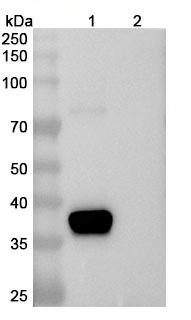 SDS-PAGE for Anti-Human IGF1 Antibody (SAA0432) | Detects recombinant human IGF1 (Catalog No.:TD-HY095011) in indirect ELISA | Western blot analysis was performed using anti-/ monoclonal antibody at 1ug/mL on various samples.Lane 1:ATGE3001 200ngLane 2:1* loading buffer