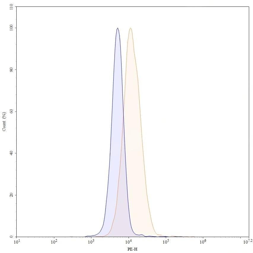 Flow-cytometry using PE anti-human CD228 antibody. A431 cells were stained with an irrelevant antibody (Blue Histogram) or an PE anti-human CD228 monoclonal antibody (Catalog No.:TD-HY094127, Yellow Histogram) at a concentration of 5 µg/ml for 30 mins at RT. After washing, and cells analysed on a NovoCyte Flow Cytometer.